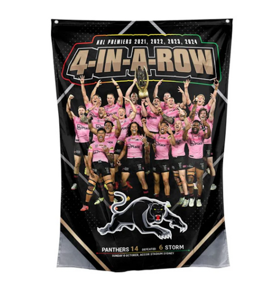 NRL 2024 PREMIERS WALL FLAG - PENRITH PANTHERS - 4 IN A ROW - 1000MM X 700MM