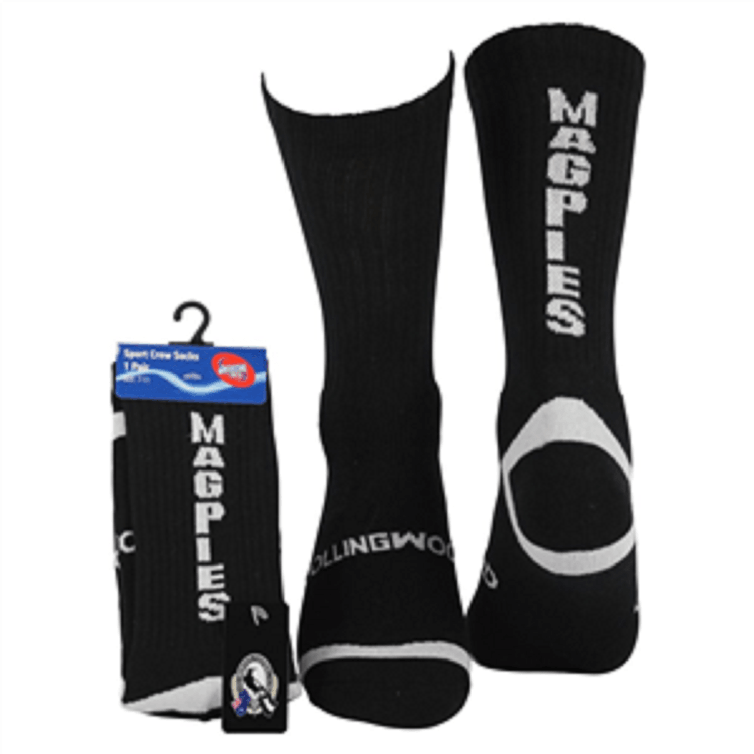 Show your support for the Collingwood Magpies with these official licensed crew socks. Each set contains genuine and authentic merchandise, brand new with tags.