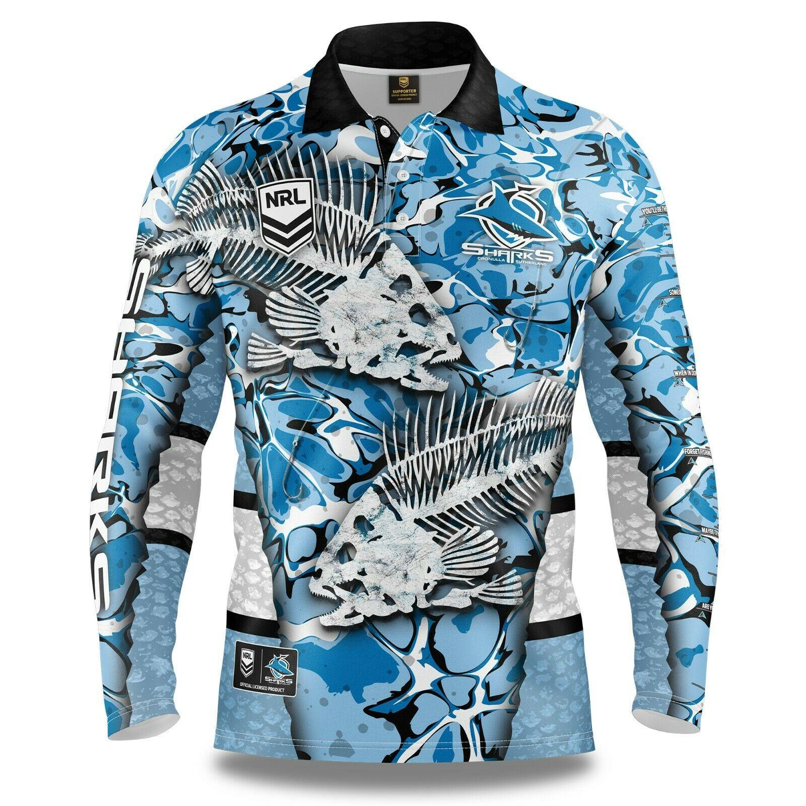 NRL 2021 Long Sleeve Skeletor Fishing Polo Tee Shirt - Cronulla Sharks - Adult