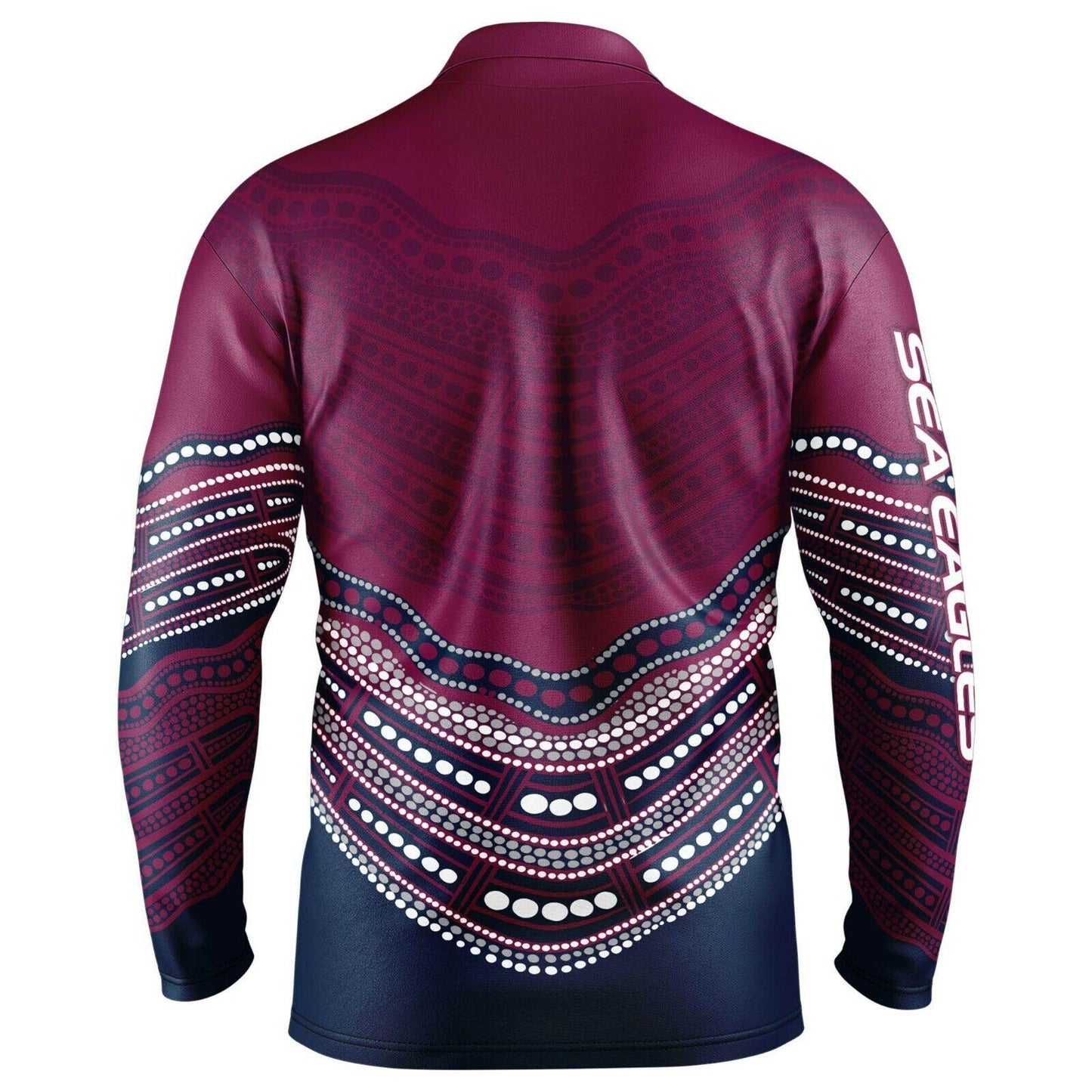 Elevate your style with the NRL Indigenous Fishing Polo Tee Shirt featuring the iconic Manly Sea Eagles emblem. Crafted for adults, this polo tee is a must-have for both fishing enthusiasts and team supporters. The design showcases a striking blend of Indigenous art and the spirit of the sea.