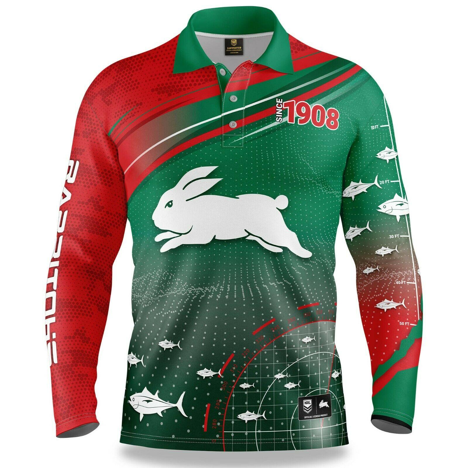 NRL Long Sleeve Fishfinder Fishing Polo Tee Shirt - South Sydney Rabbitohs YOUTH