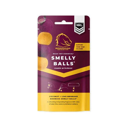 Introducing the NRL Smelly Balls Set, featuring the iconic Brisbane Broncos design. This re-usable car air freshener not only adds a touch of team spirit to your vehicle but also keeps it smelling fresh and inviting. Crafted with high-quality materials and officially licensed, this product is a must-have for all Brisbane Broncos supporters.